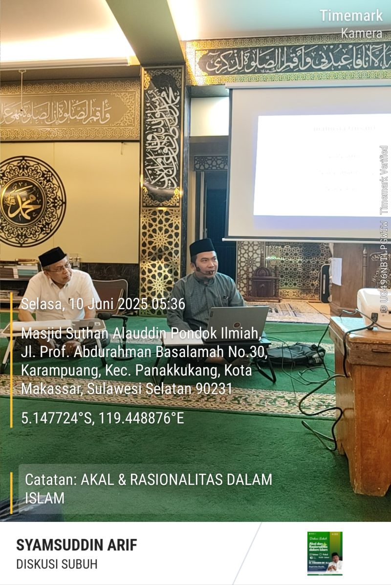 Makassar, Pilarindonesia.com – Cendekiawan Muslim, Dr. Syamsuddin Arif, MA., membawakan kajian Subuh bertema “Akal dan Rasionalitas dalam Islam”, di Masjid Sultan Alauddin, Jalan Prof. Abdurrahman Basalamah, Kota Makassar, Selasa pagi (10/6/2025).